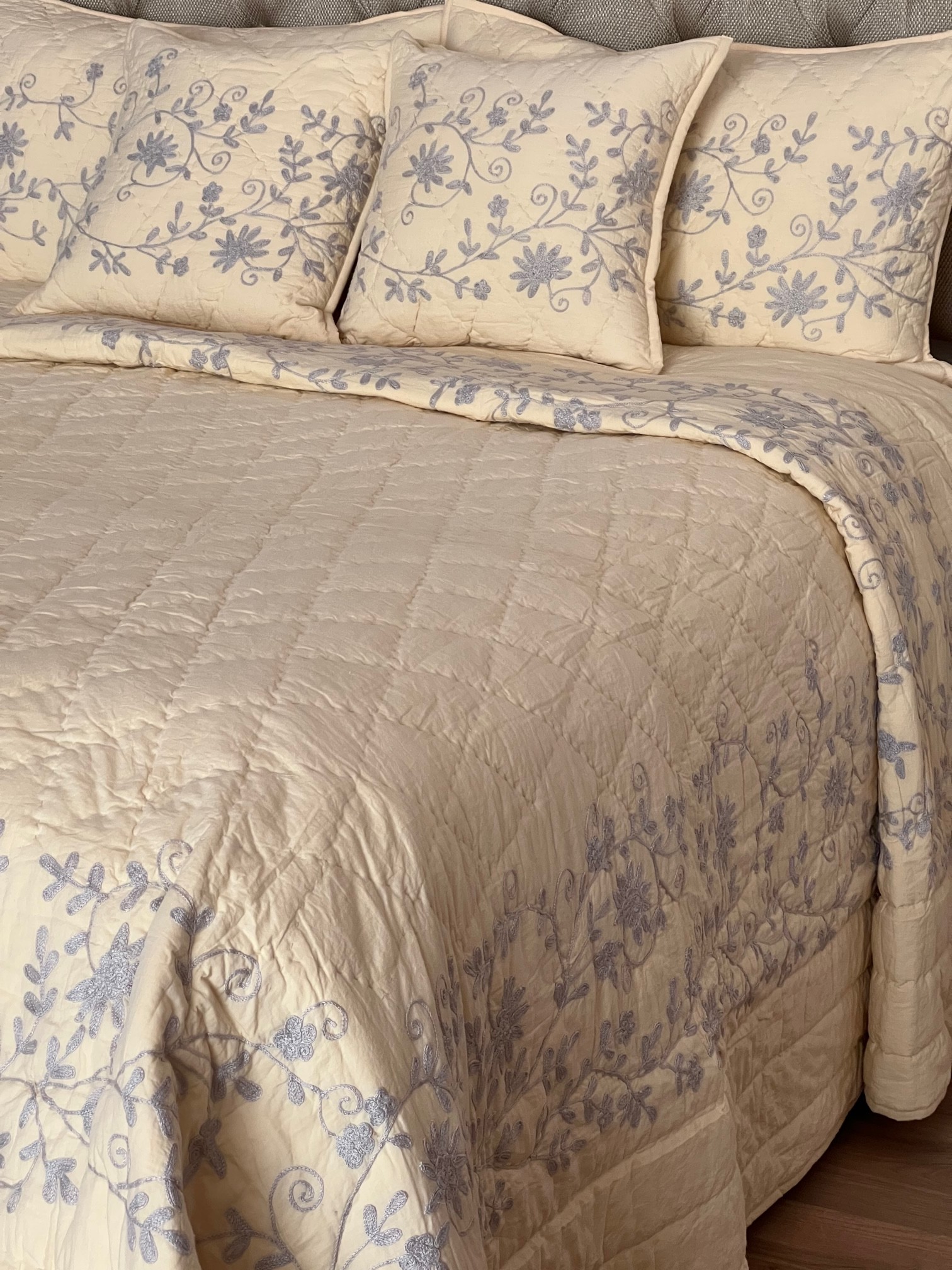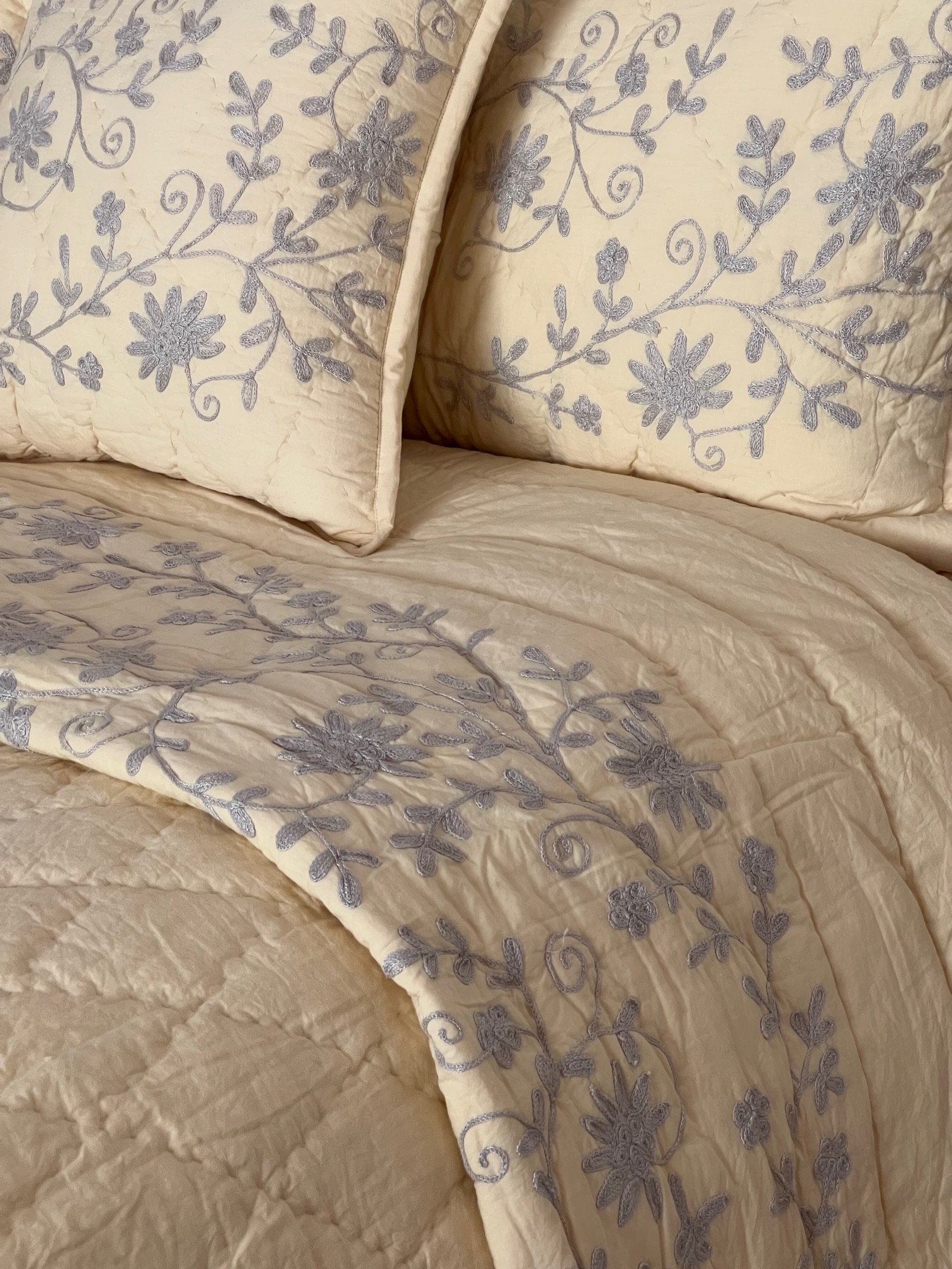 Named after a town known for its artisan spirit, the Elora Quilt Set showcases intricate Aari embroidery, a traditional handwork technique requiring skill and patience. The result is a richly textured surface that brings warmth, heritage, and craftsmanship into everyday living.